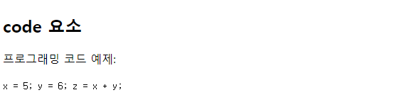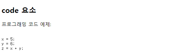 | <!DOCTYPE html> <html> <body> <h2>code 요소</h2> <p>프로그래밍 코드 예제:</p> <code> x = 5; y = 6; z = x + y; </code> </body> </html> |