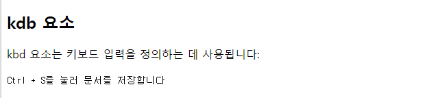 | <!DOCTYPE html> <html> <body> <h2>kdb 요소</h2> <p>kbd 요소는 키보드 입력을 정의하는 데 사용됩니다:</p> <p><kbd>Ctrl + S를 눌러 문서를 저장합니다</kbd></p> </body> </html> |