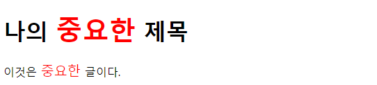 | <!DOCTYPE html> <html> <head> <style> .note { font-size: 120%; color: red; } </style> </head> <body> <h1>나의 <span class="note">중요한</span> 제목</h1> <p>이것은 <span class="note">중요한</span> 글이다.</p> </body> </html> |