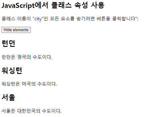 | <!DOCTYPE html> <html> <body> <h2>JavaScript에서 클래스 속성 사용</h2> <p>클래스 이름이 "city"인 모든 요소를 숨기려면 버튼을 클릭합니다":</p> <button onclick="myFunction()">Hide elements</button> <h2 class="city">런던</h2> <p>런던은 영국의 수도이다.</p> <h2 class="city">워싱턴</h2> <p>워싱턴은 미국의 수도이다.</p> <h2 class="city">서울</h2> <p>서울은 대한민국의 수도이다.</p> <script> function myFunction() { var x = document.getElementsByClassName("city"); for (var i = 0; i < x.length; i++) { x[i].style.display = "none"; } } </script> </body> </html> |