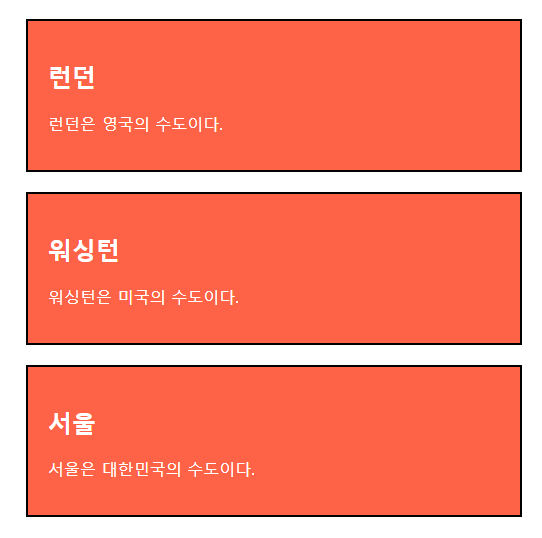 | <!DOCTYPE html> <html> <head> <style> .city { background-color: tomato; color: white; border: 2px solid black; margin: 20px; padding: 20px; } </style> </head> <body> <div class="city"> <h2>런던</h2> <p>런던은 영국의 수도이다.</p> </div> <div class="city"> <h2>워싱턴</h2> <p>워싱턴은 미국의 수도이다.</p> </div> <div class="city"> <h2>서울</h2> <p>서울은 대한민국의 수도이다.</p> </div> </body> </html> |