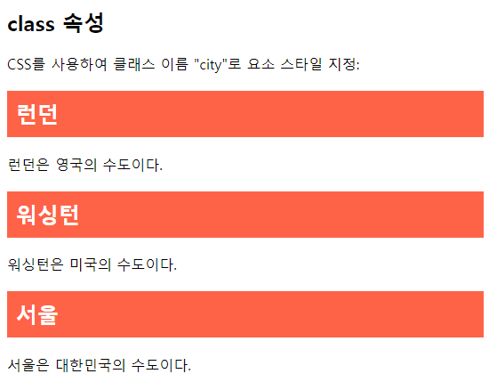 | <!DOCTYPE html> <html> <head> <style> .city { background-color: tomato; color: white; padding: 10px; } </style> </head> <body> <h2>class 속성</h2> <p>CSS를 사용하여 클래스 이름 "city"로 요소 스타일 지정:</p> <h2 class="city">런던</h2> <p>런던은 영국의 수도이다.</p> <h2 class="city">워싱턴</h2> <p>워싱턴은 미국의 수도이다.</p> <h2 class="city">서울</h2> <p>서울은 대한민국의 수도이다.</p> </body> </html> |