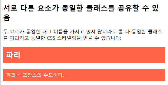| <!DOCTYPE html> <html> <head> <style> .city { background-color: tomato; color: white; padding: 10px; } </style> </head> <body> <h2>서로 다른 요소가 동일한 클래스를 공유할 수 있음</h2> <p>두 요소가 동일한 태그 이름을 가지고 있지 않더라도 둘 다 동일한 클래스를 가리키고 동일한 CSS 스타일링을 얻을 수 있습니다:</p> <h2 class="city">파리</h2> <p class="city">파리는 프랑스의 수도이다.</p> </body> </html> |