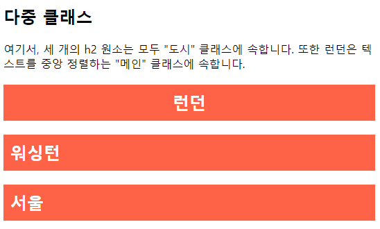 | <!DOCTYPE html> <html> <head> <style> .city { background-color: tomato; color: white; padding: 10px; } .main { text-align: center; } </style> </head> <body> <h2>다중 클래스</h2> <p>여기서, 세 개의 h2 원소는 모두 "도시" 클래스에 속합니다. 또한 런던은 텍스트를 중앙 정렬하는 "메인" 클래스에 속합니다.</p> <h2 class="city main">런던</h2> <h2 class="city">워싱턴</h2> <h2 class="city">서울</h2> </body> </html> |