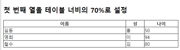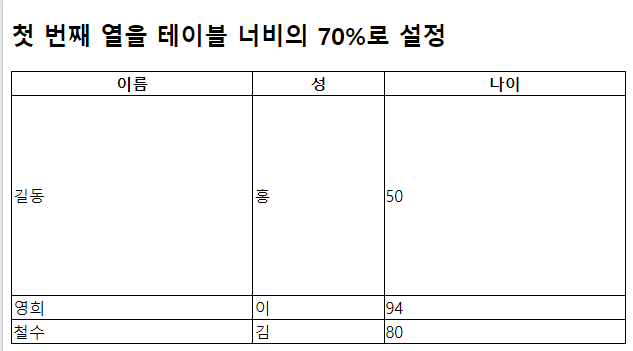 | <!DOCTYPE html> <html> <style> table, th, td { border:1px solid black; border-collapse: collapse; } </style> <body> <h2>첫 번째 열을 테이블 너비의 70%로 설정</h2> <table style="width:100%"> <tr> <th style="width:70%">이름</th> <th>성</th> <th>나이</th> </tr> <tr> <td>길동</td> <td>홍</td> <td>50</td> </tr> <tr> <td>영희</td> <td>이</td> <td>94</td> </tr> <tr> <td>철수</td> <td>김</td> <td>80</td> </tr> </table> </body> </html> |