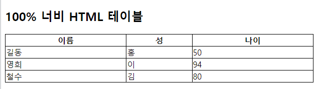 | <!DOCTYPE html> <html> <style> table, th, td { border:1px solid black; border-collapse: collapse; } </style> <body> <h2>100% 너비 HTML 테이블</h2> <table style="width:100%"> <tr> <th>이름</th> <th>성</th> <th>나이</th> </tr> <tr> <td>길동</td> <td>홍</td> <td>50</td> </tr> <tr> <td>영희</td> <td>이</td> <td>94</td> </tr> <tr> <td>철수</td> <td>김</td> <td>80</td> </tr> </table> </body> </html> |