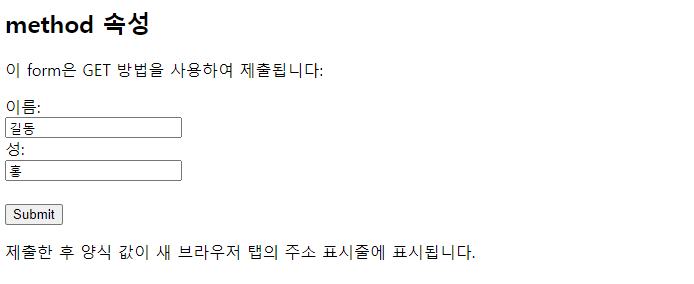 | <!DOCTYPE html> <html> <body> <h2>method 속성</h2> <p>이 form은 GET 방법을 사용하여 제출됩니다:</p> <form action="/action_page.php" target="_blank" method="get"> <label for="fname">이름:</label><br> <input type="text" id="fname" name="fname" value="길동"><br> <label for="lname">성:</label><br> <input type="text" id="lname" name="lname" value="홍"><br><br> <input type="submit" value="Submit"> </form> <p>제출한 후 양식 값이 새 브라우저 탭의 주소 표시줄에 표시됩니다.</p> </body> </html> |