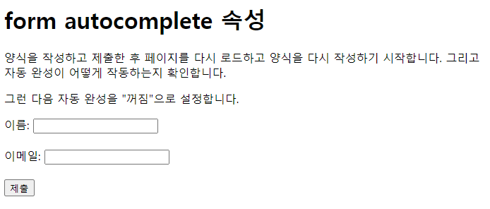 form autocomplete 속성은 양식에 자동 완성 기능을 설정할지 여부를 지정한다.