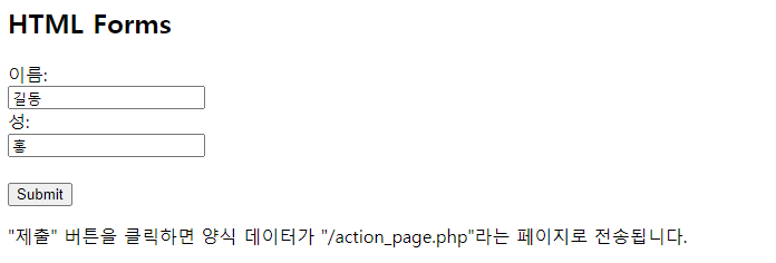 | <!DOCTYPE html> <html> <body> <h2>HTML Forms</h2> <form action="/action_page.php"> <label for="fname">이름:</label><br> <input type="text" id="fname" name="fname" value="길동"><br> <label for="lname">성:</label><br> <input type="text" id="lname" name="lname" value="홍"><br><br> <input type="submit" value="Submit"> </form> <p>"제출" 버튼을 클릭하면 양식 데이터가 "/action_page.php"라는 페이지로 전송됩니다.</p> </body> </html> |