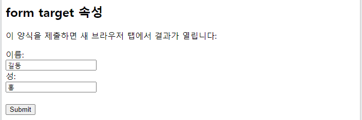 target 속성은 양식을 제출한 후 수신된 응답을 표시할 위치를 지정한다.