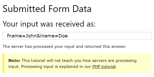 아래에는 서버에 전송된 데이터는 'fname=John&lname=Doe'가 서버에서 처리되고 그에 대해 응답을 클라이언트에 회신할 것이다.