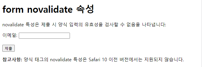 | novalidate | 제출 시 양식의 유효성을 검사하지 않도록 지정합니다 |