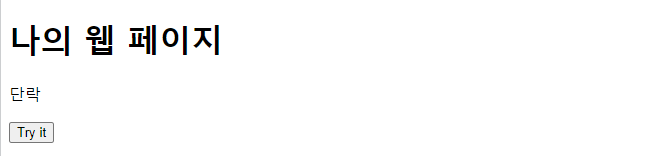 | <!DOCTYPE html> <html> <head> <title>페이지 제목</title> <script> function myFunction() { document.getElementById("demo").innerHTML = "Hello JavaScript!"; } </script> </head> <body> <h1>나의 웹 페이지</h1> <p id="demo">단락</p> <button type="button" onclick="myFunction()">Try it</button> </body> </html> |