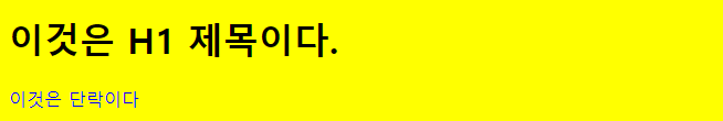 | <!DOCTYPE html> <html> <head> <title>페이지 제목</title> <style> body {background-color: powderblue;} h1 {color: red;} p {color: blue;} </style> </head> <body> <h1>이것은 H1 제목이다.</h1> <p>이것은 단락이다.</p> <p>본문 요소의 내용이 브라우저 창에 표시됩니다.</p> <p>제목 요소의 내용은 브라우저 탭, 즐겨찾기 및 검색 엔진 결과에 표시됩니다.</p> </body> </html> |