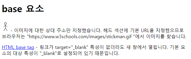 | <!DOCTYPE html> <html> <head> <base href="https://www.w3schools.com/" target="_blank"> </head> <body> <h1>base 요소</h1> <p><img src="images/stickman.gif" width="24" height="39" alt="Stickman"> - 이미지에 대한 상대 주소만 지정했습니다. 헤드 섹션에 기본 URL을 지정했으므로 브라우저는 "https://www.w3schools.com/images/stickman.gif "에서 이미지를 찾습니다.</p> <p><a href="tags/tag_base.asp">HTML base tag</a> - 링크가 target="_blank" 특성이 없더라도 새 창에서 열립니다. 기본 요소의 대상 특성이 "_blank"로 설정되어 있기 때문입니다.</p> </body> </html> |
