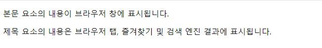 | <!DOCTYPE html> <html> <head> <title>의미있는 페이 제목</title> </head> <body> <p>본문 요소의 내용이 브라우저 창에 표시됩니다.</p> <p>제목 요소의 내용은 브라우저 탭, 즐겨찾기 및 검색 엔진 결과에 표시됩니다.</p> </body> </html> |