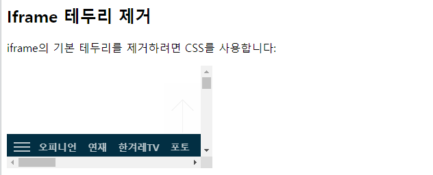 | <!DOCTYPE html> <html> <body> <h2>Iframe 테두리 제거</h2> <p>iframe의 기본 테두리를 제거하려면 CSS를 사용합니다:</p> <iframe src="https://www.hani.co.kr/arti/politics/defense/1089612.html" style="border:none;" title="Iframe Example"></iframe> </body> </html> |