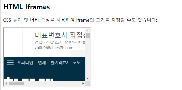 | <!DOCTYPE html> <html> <body> <h2>HTML Iframes</h2> <p>CSS 높이 및 너비 속성을 사용하여 iframe의 크기를 지정할 수도 있습니다:</p> <iframe src="https://www.hani.co.kr/arti/politics/defense/1089612.html" style="height:200px;width:300px" title="Iframe Example"></iframe> </body> </html> |