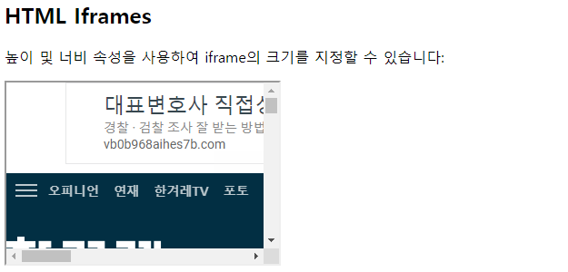 | <!DOCTYPE html> <html> <body> <h2>HTML Iframes</h2> <p>높이 및 너비 속성을 사용하여 iframe의 크기를 지정할 수 있습니다:</p> <iframe src="https://www.hani.co.kr/arti/politics/defense/1089612.html" height="200" width="300" title="Iframe Example"></iframe> </body> </html> |