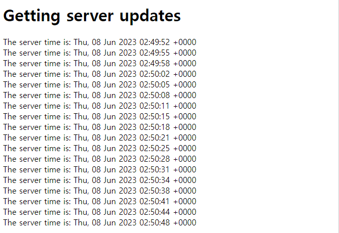 | <!DOCTYPE html> <html> <body> <h1>서버 업데이트 가져오기</h1> <div id="result"></div> <script> if(typeof(EventSource) !== "undefined") { var source = new EventSource("demo_sse.php"); source.onmessage = function(event) { document.getElementById("result").innerHTML += event.data + "<br>"; }; } else { document.getElementById("result").innerHTML = "Sorry, your browser does not support server-sent events..."; } </script> </body> </html> |