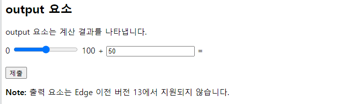 | <!DOCTYPE html> <html> <body> <h2> output 요소</h2> <p>output 요소는 계산 결과를 나타냅니다.</p> <form action="/action_page.php" oninput="x.value=parseInt(a.value)+parseInt(b.value)"> 0 <input type="range" id="a" name="a" value="50"> 100 + <input type="number" id="b" name="b" value="50"> = <output name="x" for="a b"></output> <br><br> <input type="submit"> </form> <p><strong>Note:</strong> 출력 요소는 Edge 이전 버전 13에서 지원되지 않습니다.</p> </body> </html> |