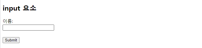 | <!DOCTYPE html> <html> <body> <h2>input 요소</h2> <form action="/action_page.php"> <label for="fname">이름:</label><br> <input type="text" id="fname" name="fname"><br><br> <input type="submit" value="Submit"> </form> </body> </html> |