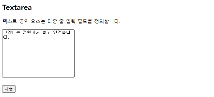 | <!DOCTYPE html> <html> <body> <h2>Textarea</h2> <p>텍스트 영역 요소는 다중 줄 입력 필드를 정의합니다.</p> <form action="/action_page.php"> <textarea name="message" rows="10" cols="30">고양이는 정원에서 놀고 있었습니다.</textarea> <br><br> <input type="submit"> </form> </body> </html> |