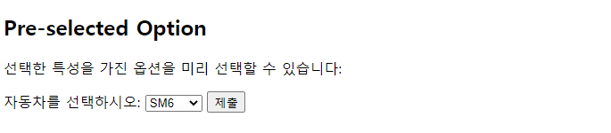 | <!DOCTYPE html> <html> <body> <h2>Pre-selected Option</h2> <p>선택한 특성을 가진 옵션을 미리 선택할 수 있습니다:</p> <form action="/action_page.php"> <label for="cars">자동차를 선택하시오:</label> <select id="cars" name="cars"> <option value="volvo">소나타</option> <option value="saab">그랜저</option> <option value="fiat" selected>SM6</option> <option value="audi">에쿠스</option> </select> <input type="submit"> </form> </body> </html> |