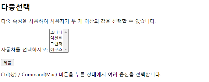| <!DOCTYPE html> <html> <body> <h2>다중선택</h2> <p>다중 속성을 사용하여 사용자가 두 개 이상의 값을 선택할 수 있습니다.</p> <form action="/action_page.php"> <label for="cars">자동차를 선택하시오:</label> <select id="cars" name="cars" size="4" multiple> <option value="volvo">소나타</option> <option value="saab">엑센트</option> <option value="fiat">그랜저</option> <option value="audi">에쿠스</option> </select><br><br> <input type="submit"> </form> <p>Ctrl(창) / Command(Mac) 버튼을 누른 상태에서 여러 옵션을 선택합니다.</p> </body> </html> |