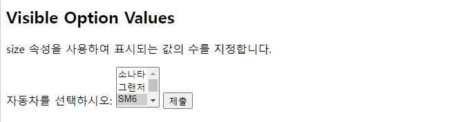 <!DOCTYPE html> <html> <body> <h2>Visible Option Values</h2> <p>size 속성을 사용하여 표시되는 값의 수를 지정합니다.</p> <form action="/action_page.php"> <label for="cars">자동차를 선택하시오:</label> <select id="cars" name="cars" size="3"> <option value="volvo">소나타</option> <option value="saab">그랜저</option> <option value="fiat" selected>SM6</option> <option value="audi">에쿠스</option> </select> <input type="submit"> </form> </body> </html> |
