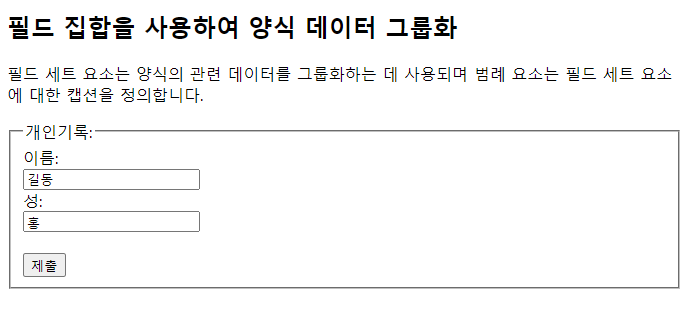 <!DOCTYPE html> <html> <body> <h2>필드 집합을 사용하여 양식 데이터 그룹화</h2> <p>필드 세트 요소는 양식의 관련 데이터를 그룹화하는 데 사용되며 범례 요소는 필드 세트 요소에 대한 캡션을 정의합니다.</p> <form action="/action_page.php"> <fieldset> <legend>개인기록:</legend> <label for="fname">이름:</label><br> <input type="text" id="fname" name="fname" value="길동"><br> <label for="lname">성:</label><br> <input type="text" id="lname" name="lname" value="홍"><br><br> <input type="submit" value="제출"> </fieldset> </form> </body> </html> |