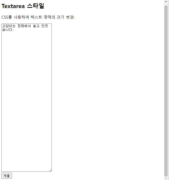 <!DOCTYPE html> <html> <body> <h2>Textarea 스타일</h2> <p>CSS를 사용하여 텍스트 영역의 크기 변경:</p> <form action="/action_page.php"> <textarea name="message" style="width:200px; height:600px;">고양이는 정원에서 놀고 있었습니다.</textarea> <br> <input type="submit"> </form> </body> </html> |