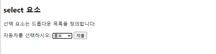 | <!DOCTYPE html> <html> <body> <h2>select 요소</h2> <p>선택 요소는 드롭다운 목록을 정의합니다:</p> <form action="/action_page.php"> <label for="cars">자동차를 선택하시오:</label> <select id="cars" name="cars"> <option value="volvo">볼보</option> <option value="saab">사브</option> <option value="fiat">피아트</option> <option value="audi">아우디</option> </select> <input type="submit"> </form> </body> </html> |