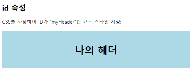 | <!DOCTYPE html> <html> <head> <style> #myHeader { background-color: lightblue; color: black; padding: 40px; text-align: center; } </style> </head> <body> <h2>id 속성</h2> <p>CSS를 사용하여 ID가 "myHeader"인 요소 스타일 지정:</p> <h1 id="myHeader">나의 헤더</h1> </body> </html> |