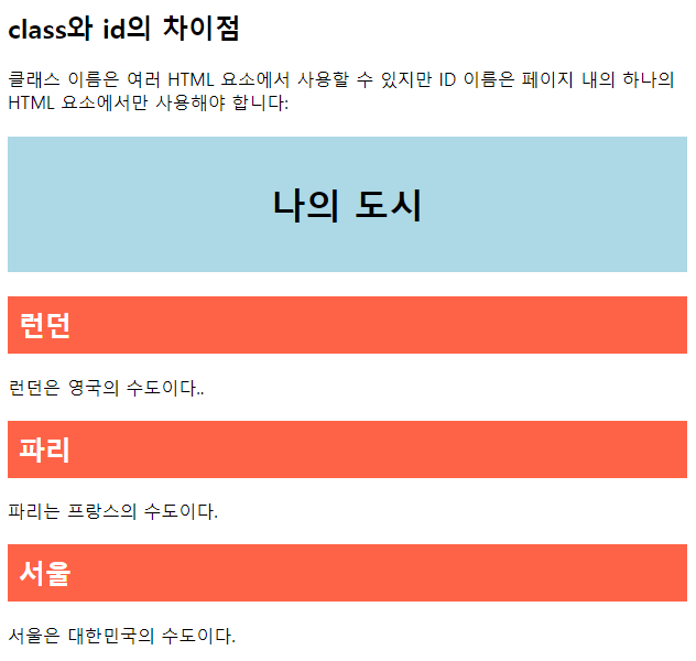 <!DOCTYPE html> <html> <head> <style> /* Style the element with the id "myHeader" */ #myHeader { background-color: lightblue; color: black; padding: 40px; text-align: center; } /* Style all elements with the class name "city" */ .city { background-color: tomato; color: white; padding: 10px; } </style> </head> <body> <h2>class와 id의 차이점</h2> <p>클래스 이름은 여러 HTML 요소에서 사용할 수 있지만 ID 이름은 페이지 내의 하나의 HTML 요소에서만 사용해야 합니다:</p> <!-- An element with a unique id --> <h1 id="myHeader">나의 도시</h1> <!-- Multiple elements with same class --> <h2 class="city">런던</h2> <p>런던은 영국의 수도이다..</p> <h2 class="city">파리</h2> <p>파리는 프랑스의 수도이다.</p> <h2 class="city">서울</h2> <p>서울은 대한민국의 수도이다.</p> </body> </html> |