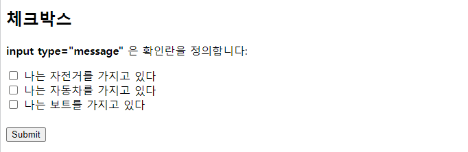 <!DOCTYPE html> <html> <body> <h2>체크박스</h2> <p><strong>input type="message" </strong>은 확인란을 정의합니다:</p> <form action="/action_page.php"> <input type="checkbox" id="vehicle1" name="vehicle1" value="Bike"> <label for="vehicle1"> 나는 자전거를 가지고 있다</label><br> <input type="checkbox" id="vehicle2" name="vehicle2" value="Car"> <label for="vehicle2"> 나는 자동차를 가지고 있다</label><br> <input type="checkbox" id="vehicle3" name="vehicle3" value="Boat"> <label for="vehicle3"> 나는 보트를 가지고 있다</label><br><br> <input type="submit" value="Submit"> </form> </body> </html> |