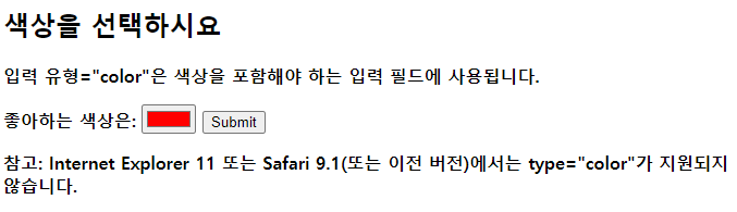 <!DOCTYPE html> <html> <body> <h2>색상을 선택하시요</h2> <p><strong>입력 유형="color"<strong>은 색상을 포함해야 하는 입력 필드에 사용됩니다.</p> <form action="/action_page.php"> <label for="favcolor">좋아하는 색상은:</label> <input type="color" id="favcolor" name="favcolor" value="#ff0000"> <input type="submit" value="Submit"> </form> <p><b>참고: Internet Explorer 11 또는 Safari 9.1(또는 이전 버전)에서는 type="color"가 지원되지 않습니다.</p> </body> </html> |