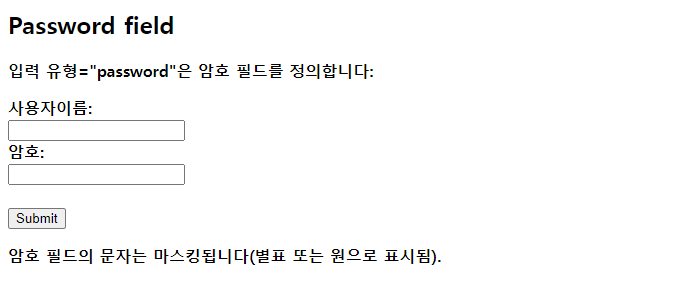 <!DOCTYPE html> <html> <body> <h2>Password field</h2> <p><strong>입력 유형="password"<strong>은 암호 필드를 정의합니다:</p> <form action="/action_page.php"> <label for="username">사용자이름:</label><br> <input type="text" id="username" name="username"><br> <label for="pwd">암호:</label><br> <input type="password" id="pwd" name="pwd"><br><br> <input type="submit" value="Submit"> </form> <p>암호 필드의 문자는 마스킹됩니다(별표 또는 원으로 표시됨).</p> </body> </html> |