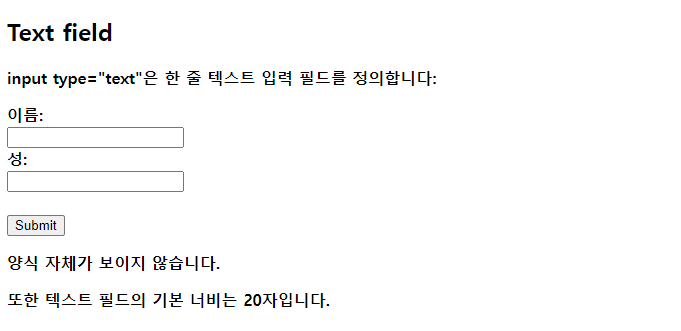 <!DOCTYPE html> <html> <body> <h2>Text field</h2> <p><strong>input type="text"<strong>은 한 줄 텍스트 입력 필드를 정의합니다:</p> <form action="/action_page.php"> <label for="fname">이름:</label><br> <input type="text" id="fname" name="fname"><br> <label for="lname">성:</label><br> <input type="text" id="lname" name="lname"><br><br> <input type="submit" value="Submit"> </form> <p>양식 자체가 보이지 않습니다.</p> <p>또한 텍스트 필드의 기본 너비는 20자입니다.</p> </body> </html> |