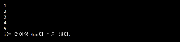 | i = 1 while i < 6: print(i) i += 1 else: print("i는 더이상 6보다 작지 않다.") |